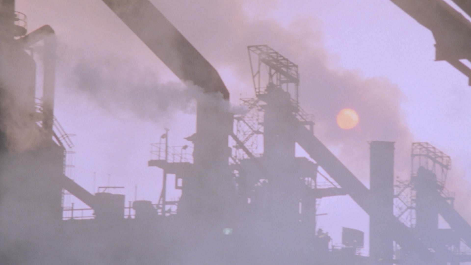> Long shot of a group of silhouetted construction workers walking up a bridge/platform at sunrise/sunset