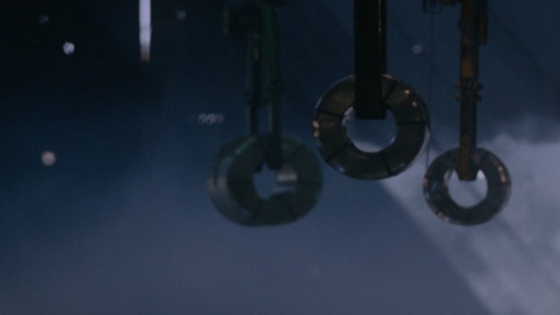 > Handheld shot of rolls of steel moved by cranes before being lowered onto a warehouse floor
