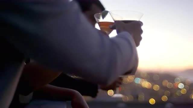 Close-up shot of young woman in sunglasses drinking beer on the beach during sunset