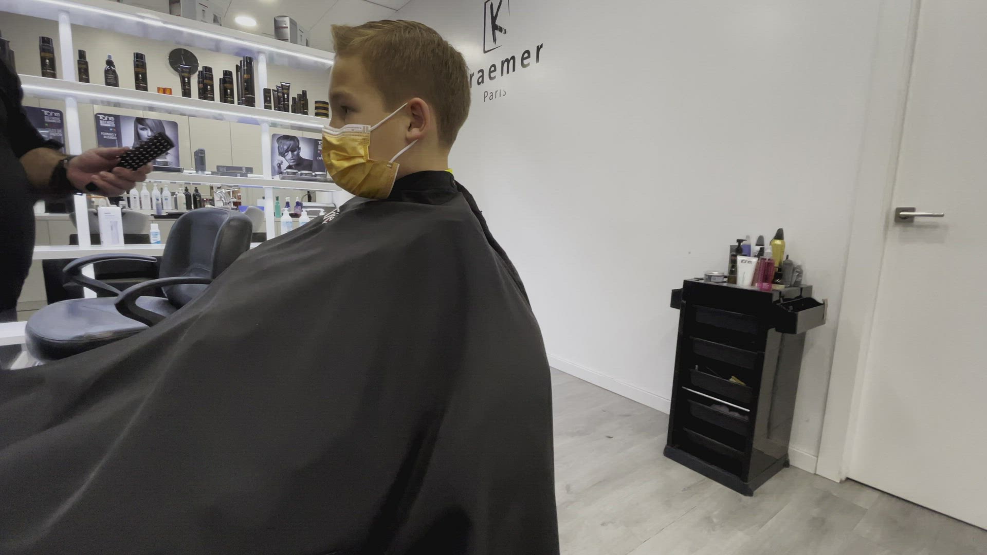 Little boy in the toy shop looking at car on the shelf and playing with it