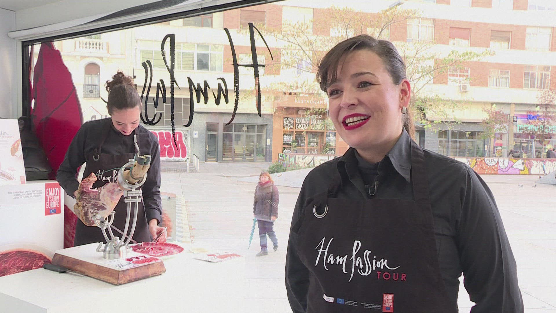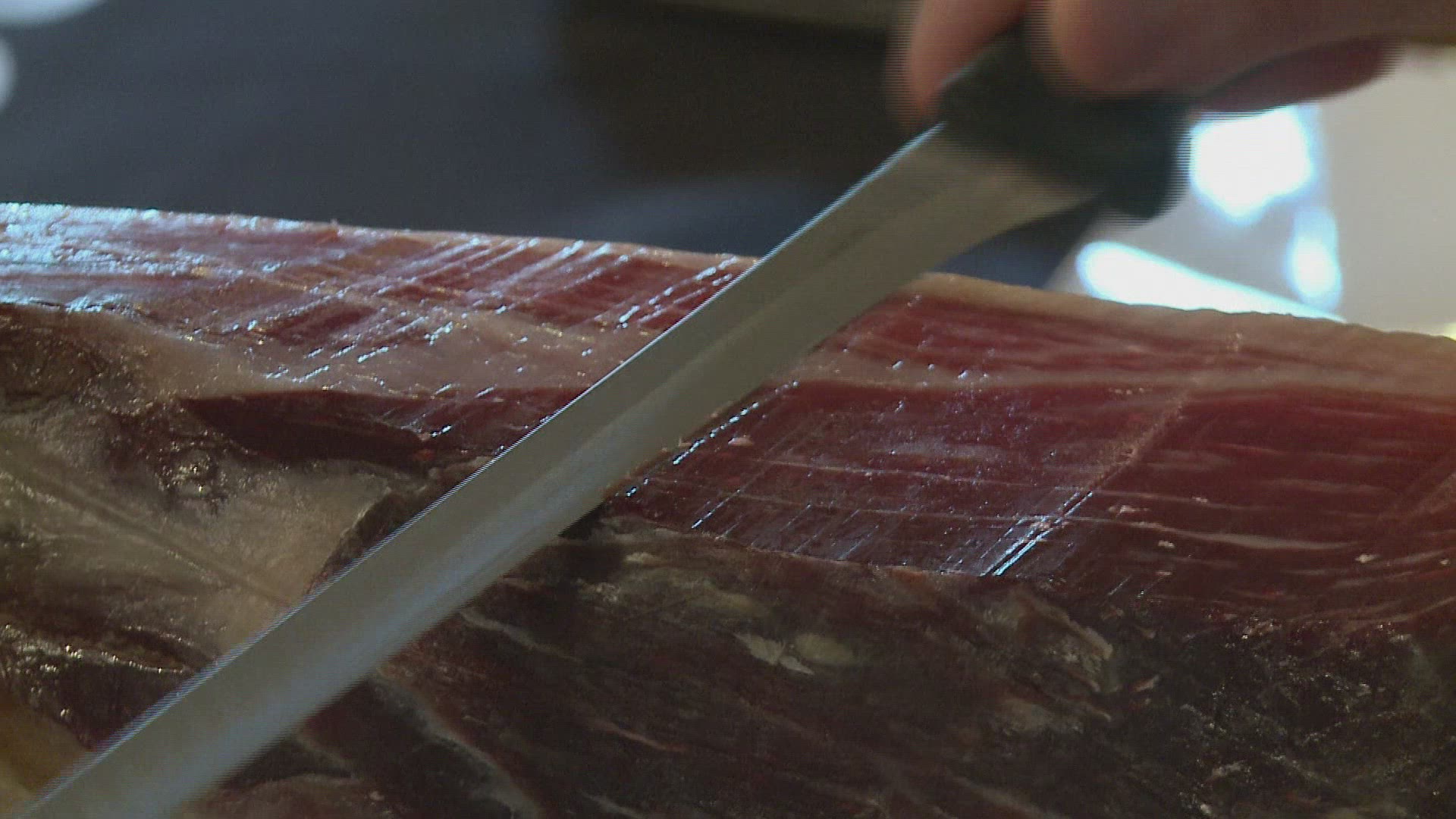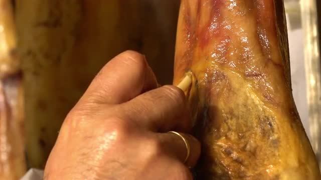 1114363 - detail of a ham leg where a ham technician inserts a small plastic punch inside the leg to check the