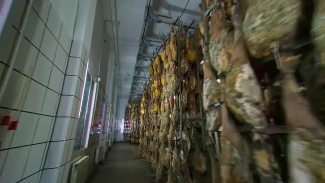 1114364 - Angled traveling image that reveals the industrial ham factory with a huge quantity of ham potatoes