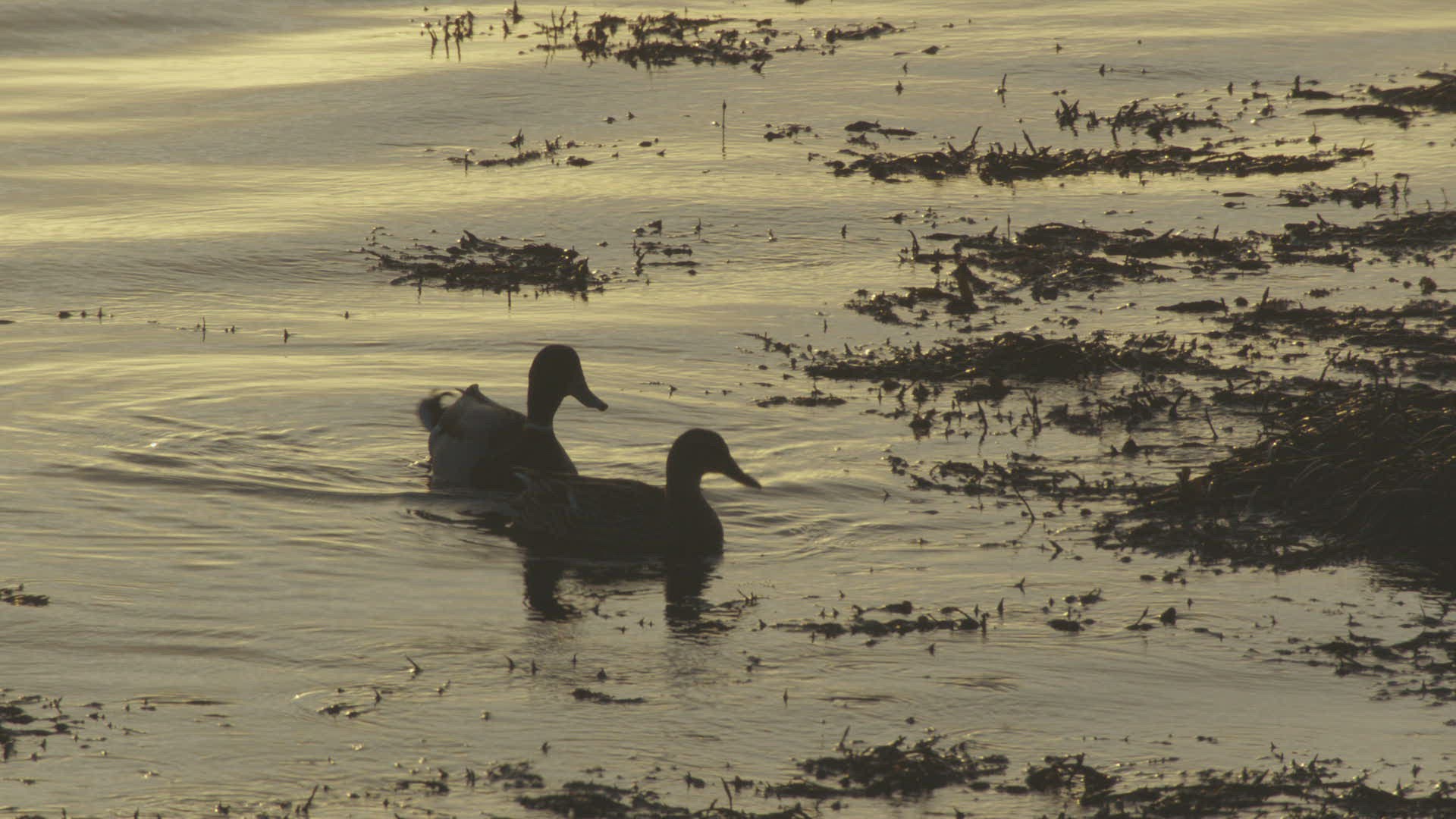 Ducks paddling around on a lake in twilight.