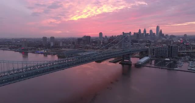 1050414 - Aerial footage of the Benjamin Franklin Bridge in Philadelphia with a pink sky