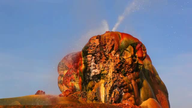 91956 - Shot of hot water spouting out of the colorful rock formation at Fly Geyser, Nevada.