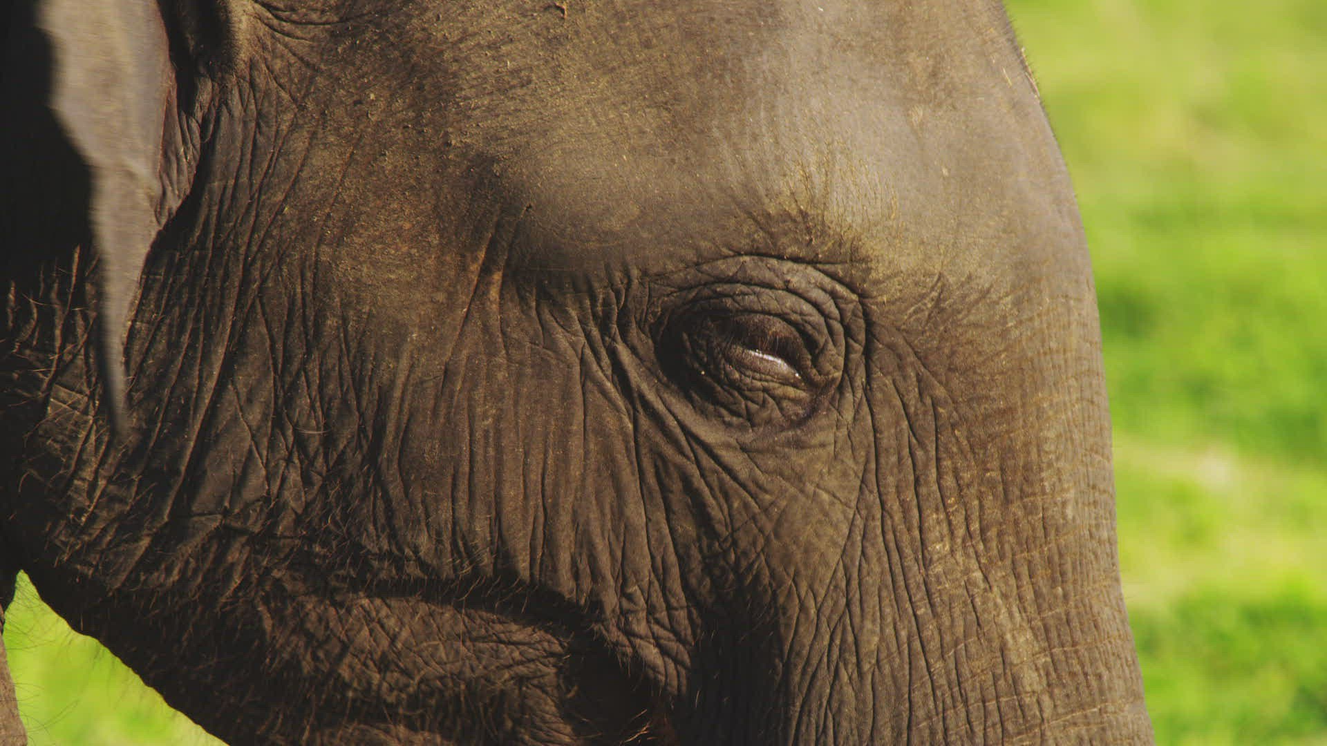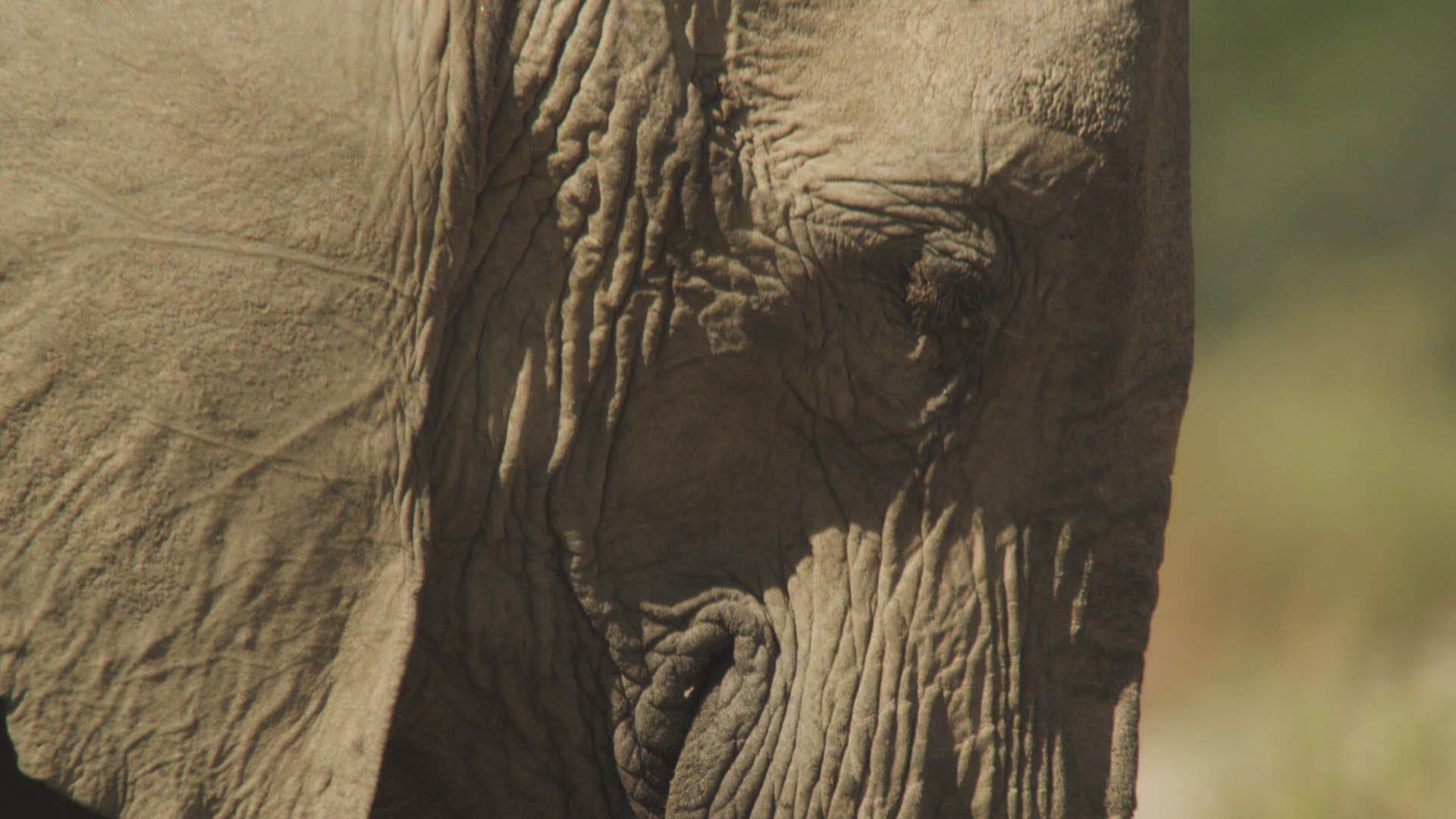 A close up shot of an elephants eye / head as he stands.