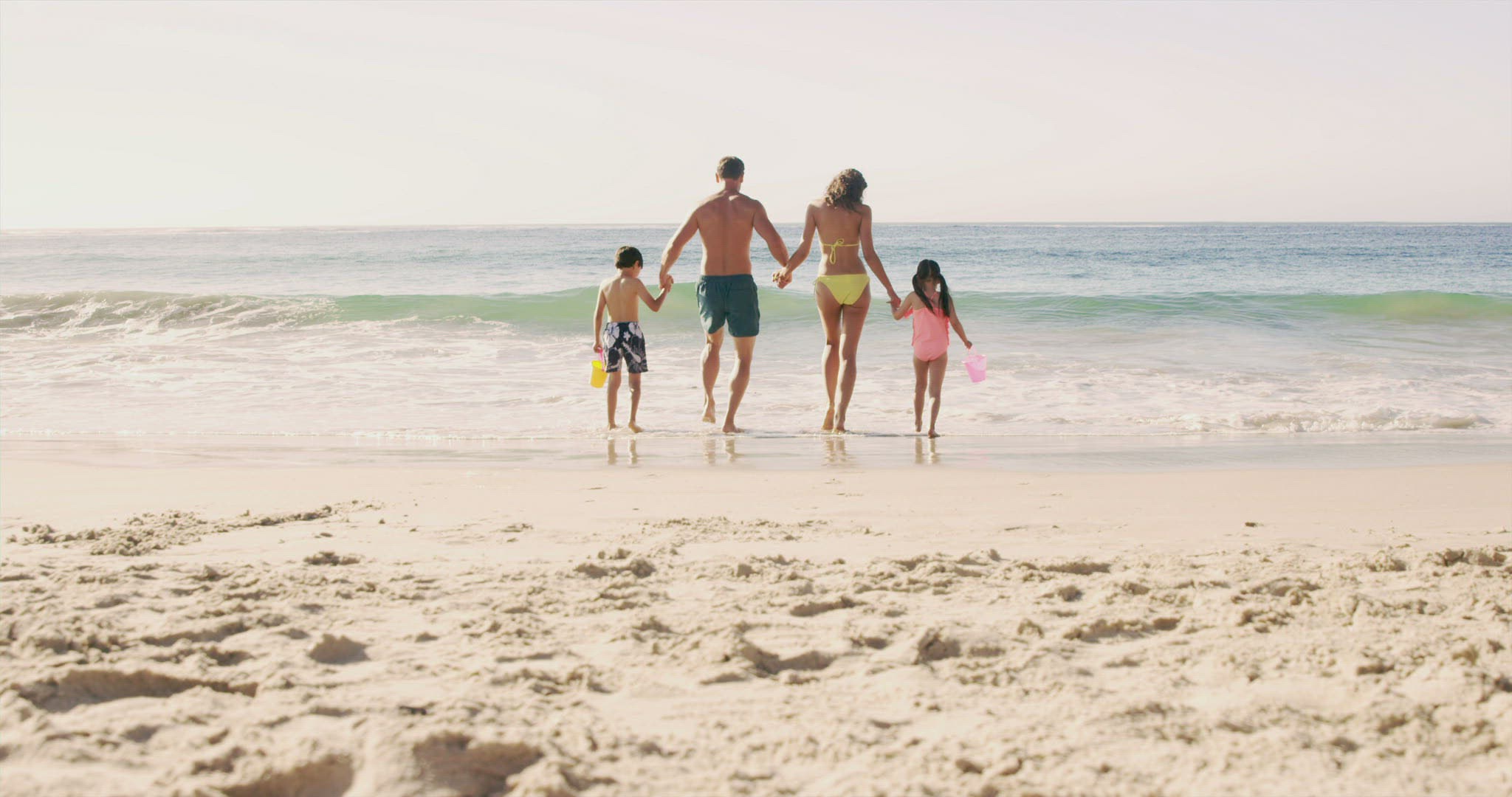 Family running on beach toward water wearing swim wear