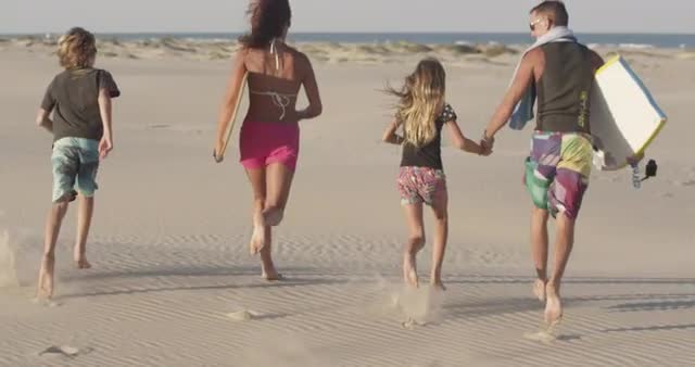 194606 - A family runs down the beach together through the water