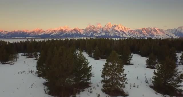 Aerial of sunrise over coniferous forest with Teton mountains in the back