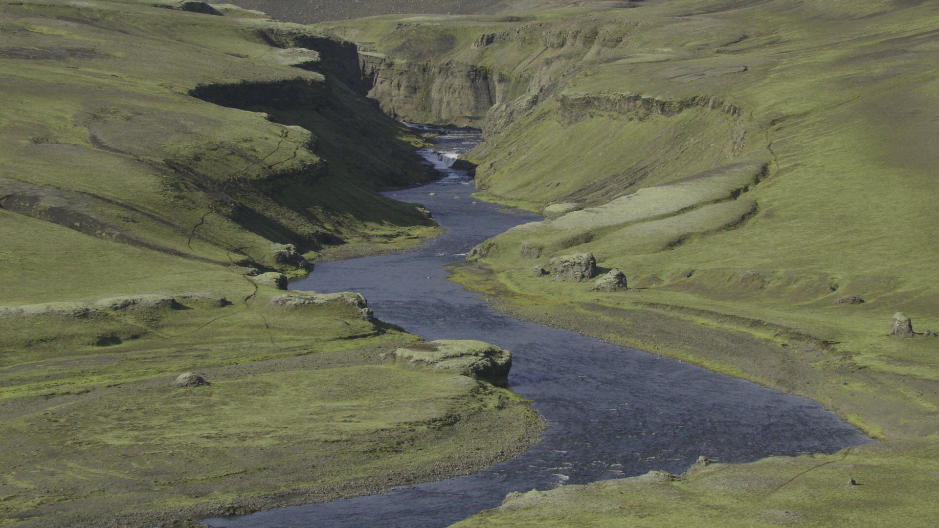 Aerial view of glacial meltwaters and volcanic ash in river deltas carving through flood plains, Arctic region, Northern Hemisphere