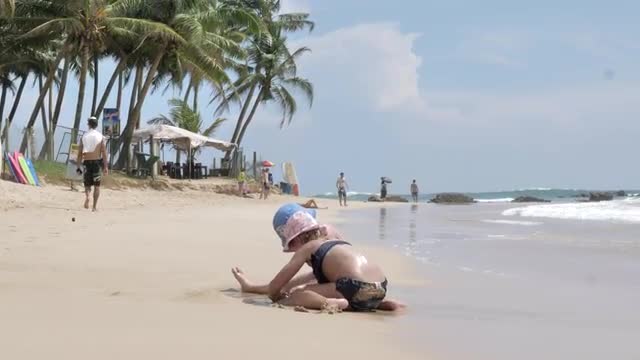 Girl with sexy green bikini bottom and boyfriend puts sandy wet hand print on her bottom