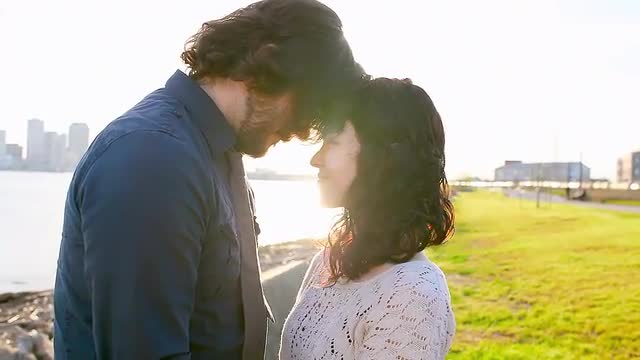 Couple embrace in a park near a bay