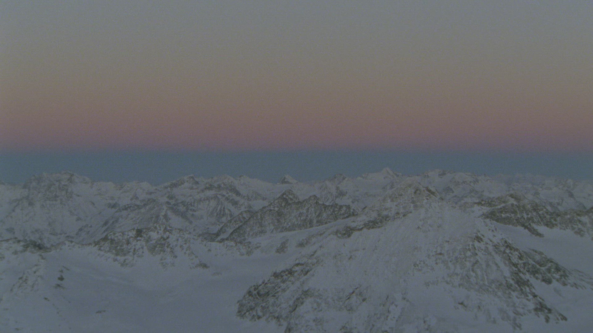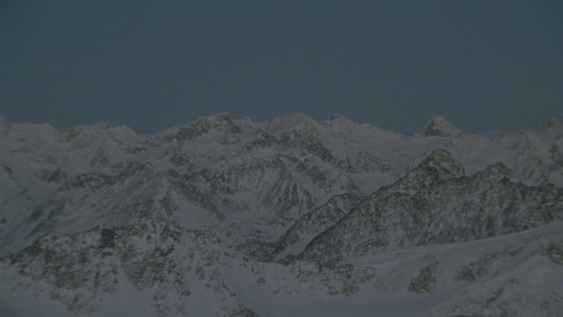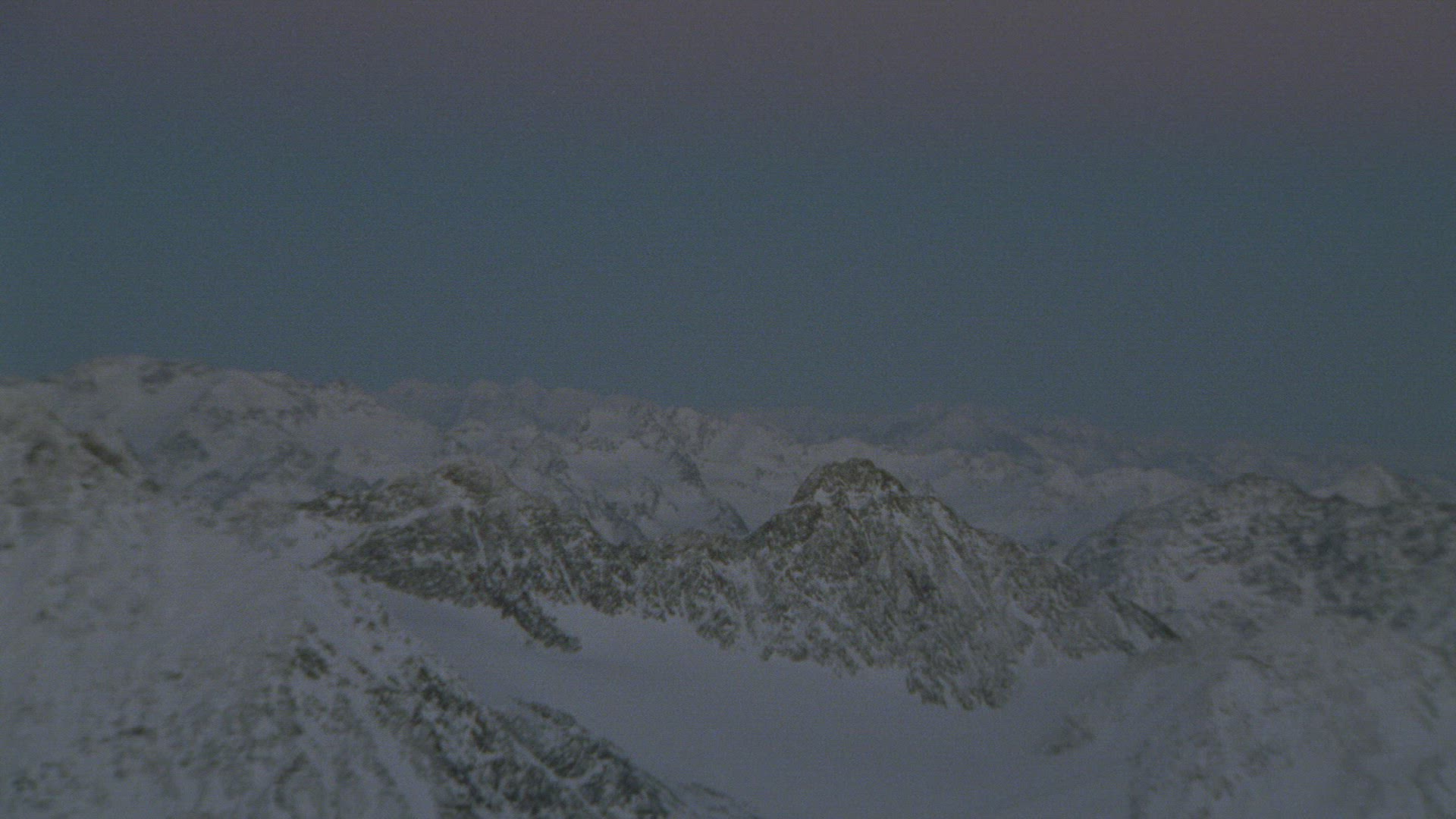 499078 - Aerial shot of snowy mountain ridgeline revealing peak