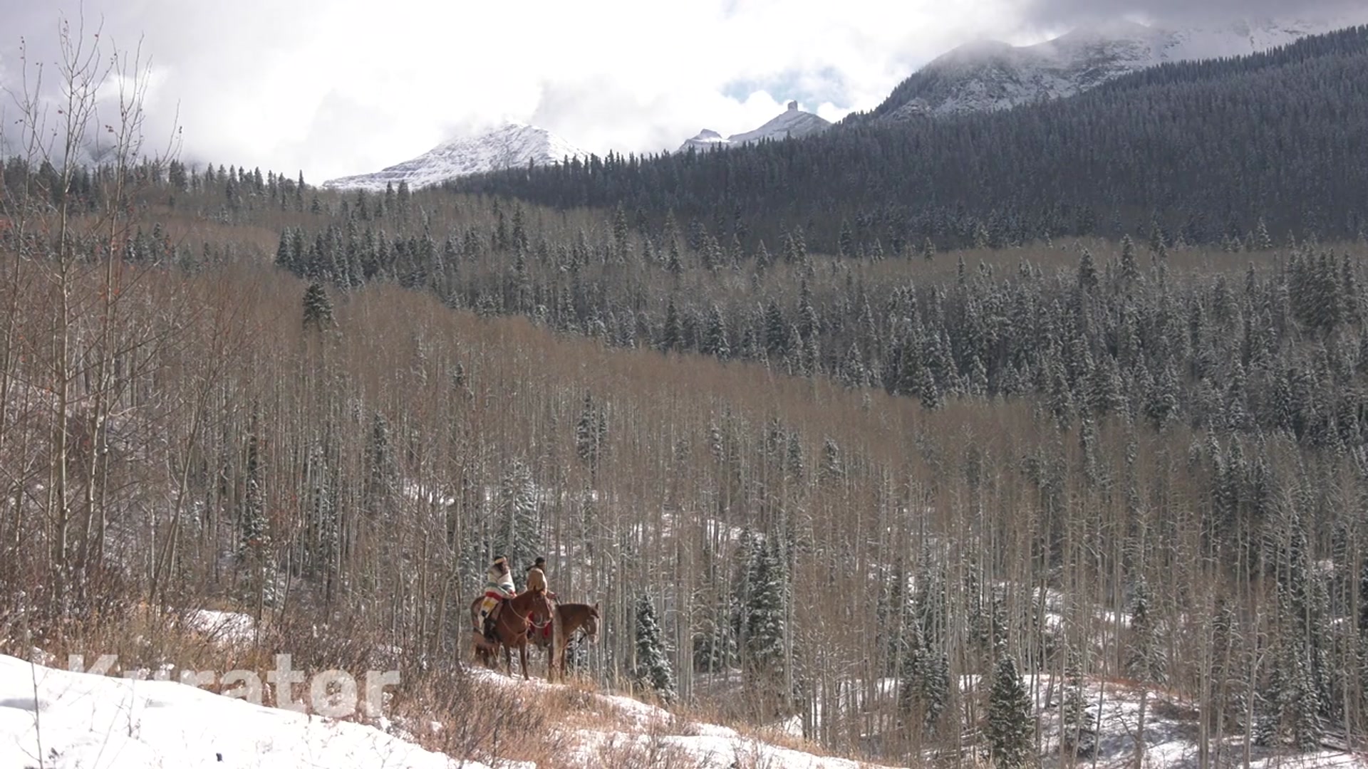 Native Couple Majestic Winter horseback riding in San Juan Mountains, Aspen Trees South West Colorado.