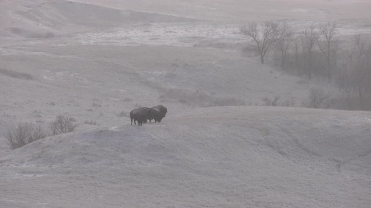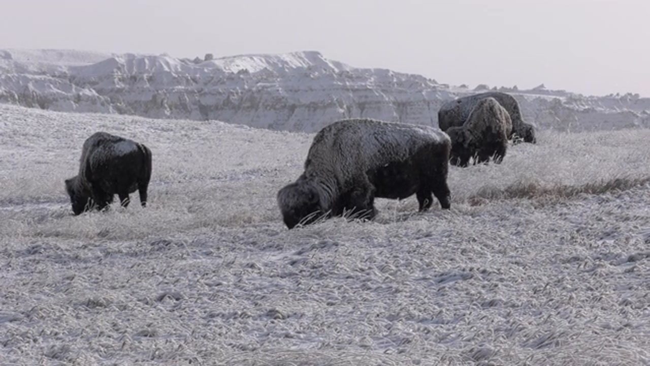 Buffalo Herd Covered in Snow Bad Lands South Dakota - Great Plains -