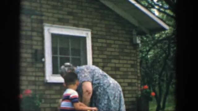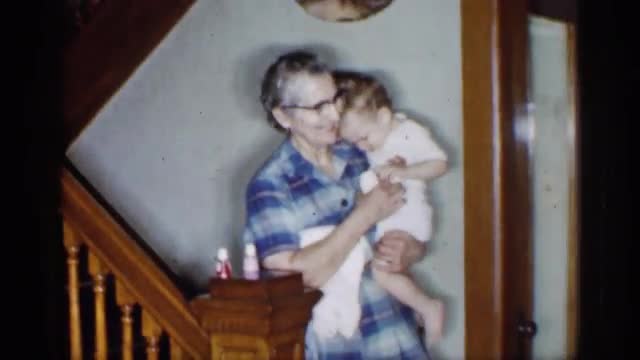 725263 - 1955: an older lady holding a toddler is seen walking down the stairs NEW YORK