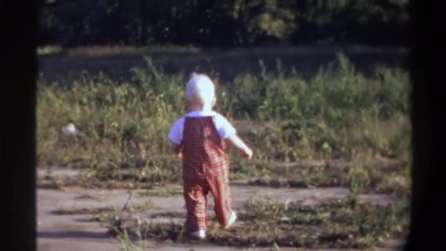 671299 - 1974: mother overseeing young toddler walking on his own in grassy field FLORIDA