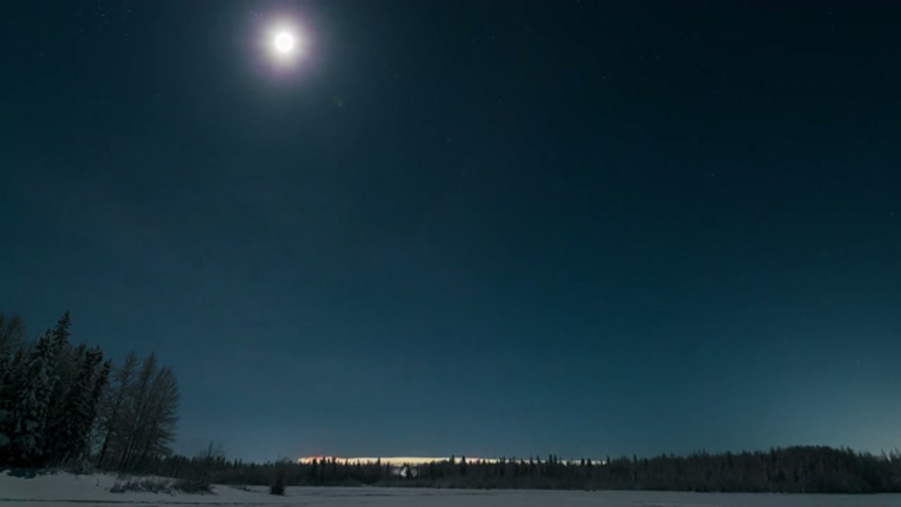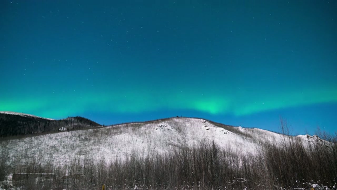 > Timelapse of Aurora Borealis Northern Lights over winter landscape in Fairbanks, Alaska