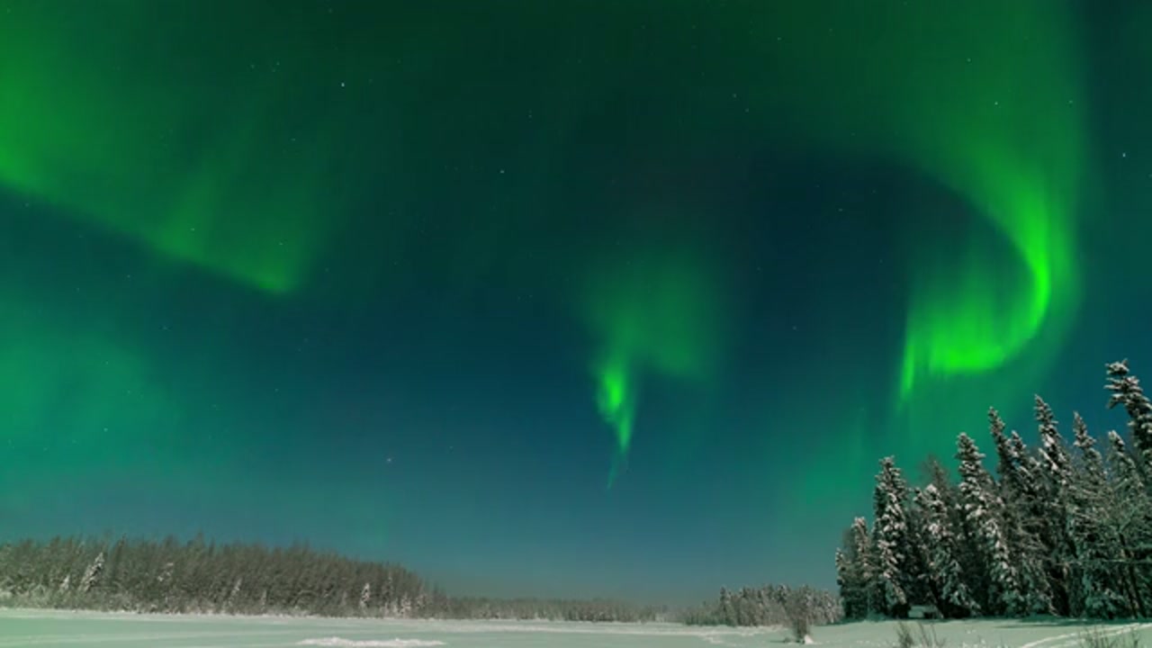 Timelapse of Aurora Borealis Northern Lights over winter landscape in Fairbanks, Alaska
