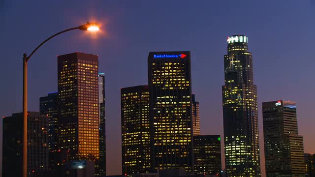 1073167 - Downtown Los Angeles Skyline transitioning from day to night.