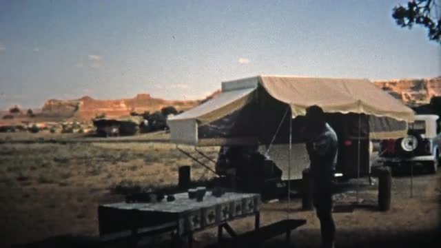 321491 - CANYONLANDS, UTAH -1971: Popup trailer camping in the mesa wastelands.