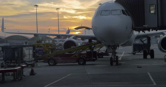 674995 - Boarding and loading airplane at sunset