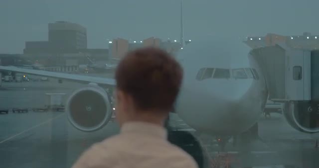 810318 - Boy looking at the plane through the airport window