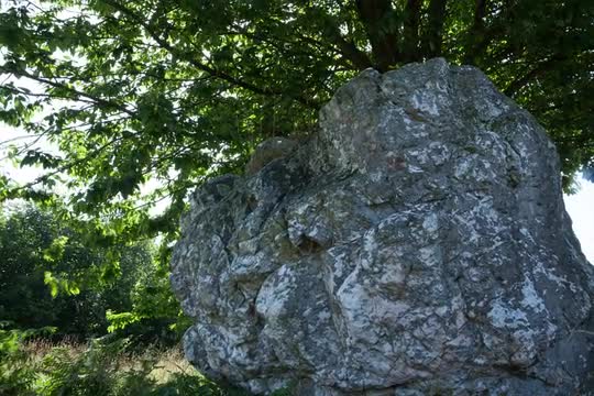 1052070 - 4K time lapse of sunset over standing stone with flowers in the foreground