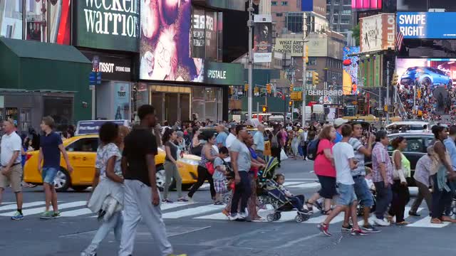 NEW YORK CITY - Circa, July, 2014 - An establishing shot of pedestrians and traffic on Broadway on a rainy day in Manhattan.