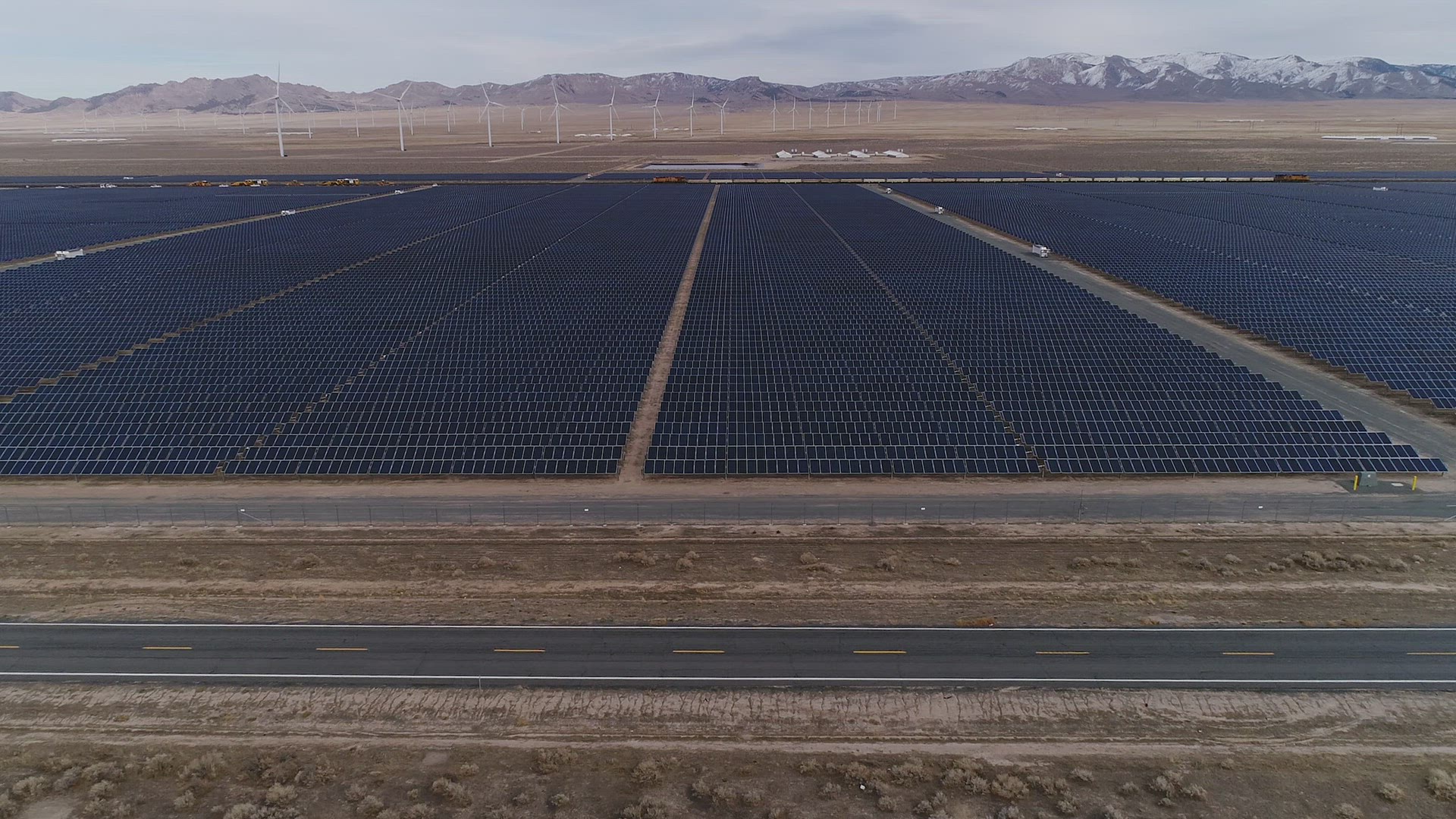 2125879 - Trucks on the highway next to solar farm looking towards snow capped mountains
