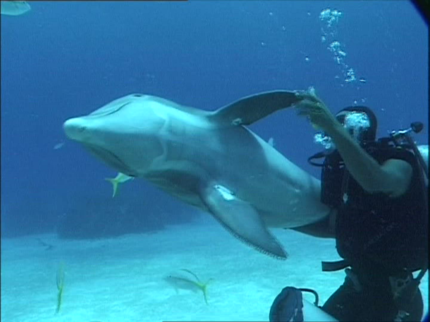 A Great Hammerhead shark swims on the ocean floor and turns to show it's teeth and eye.