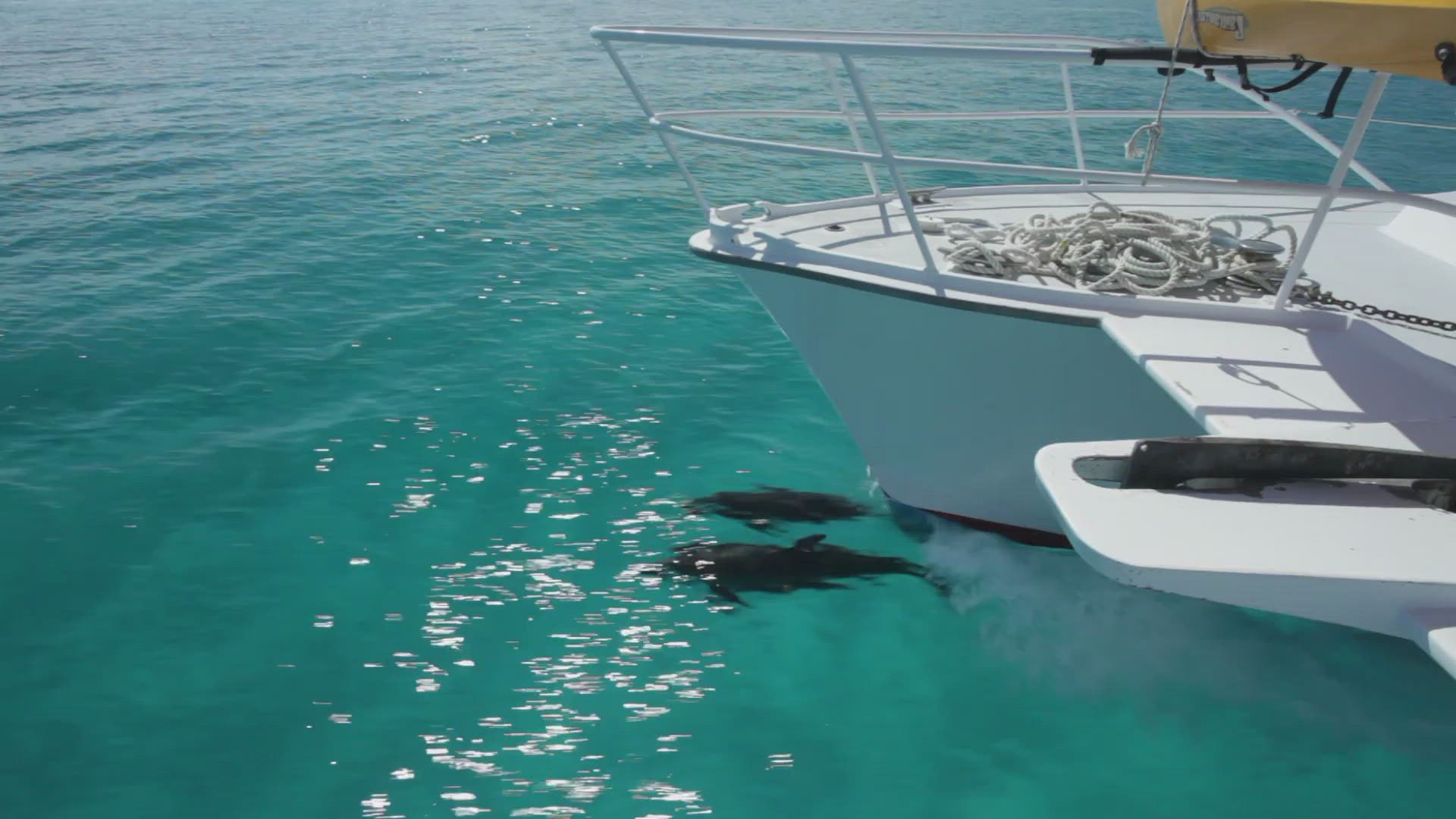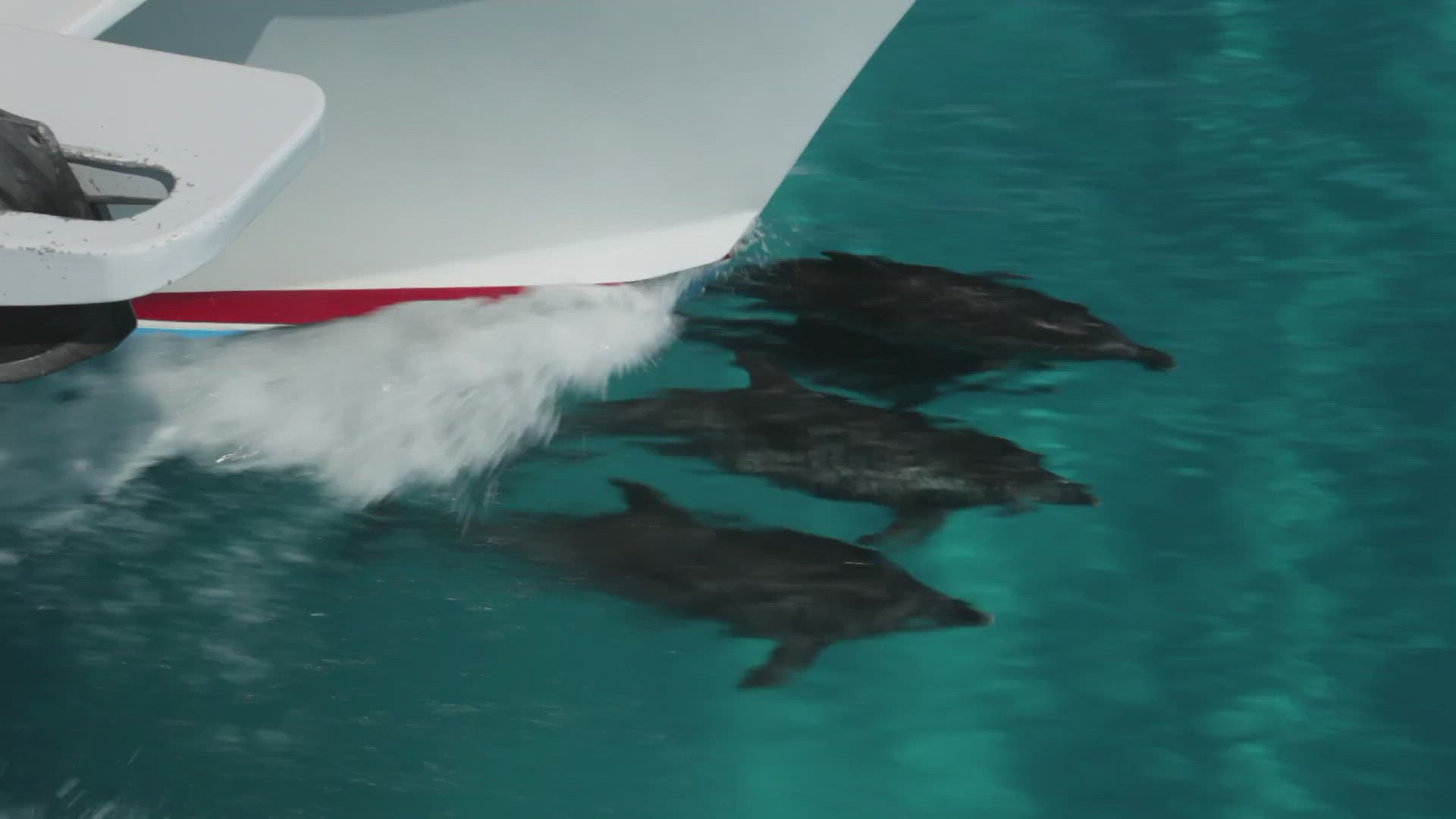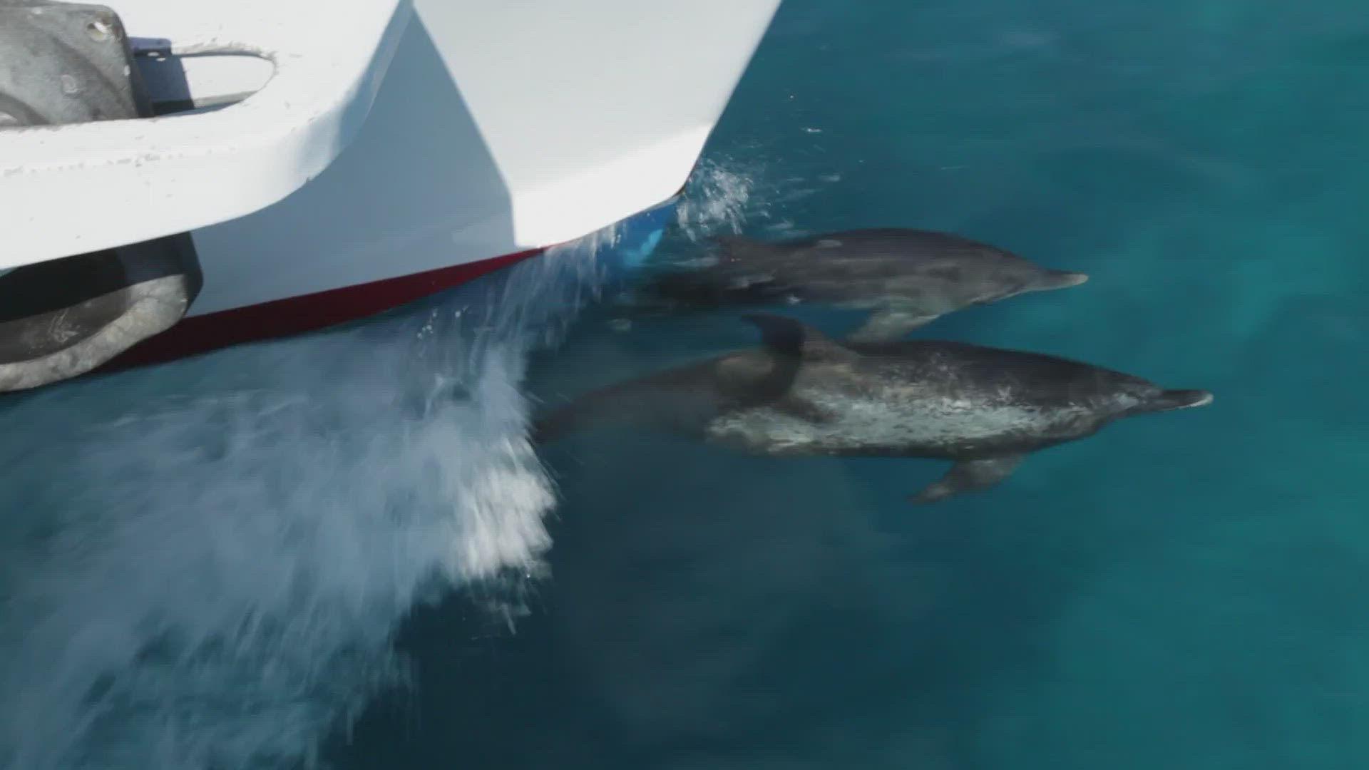 A pod of wild atlantic spotted dolphins calmly glide along the ocean floor.
