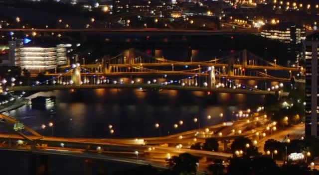 302468 - An evening establishing shot of the iconic fountain at The Point in downtown Pittsburgh, PA.