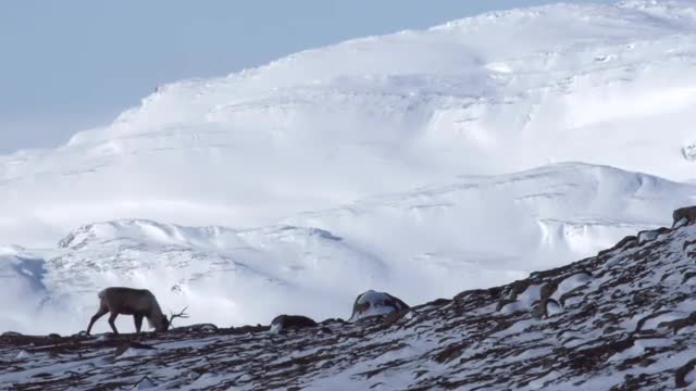 A reindeer is eating in a nordic rough landscape