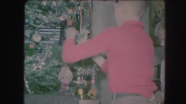 635921 - 1958: older boy in red shirt and girl in white shirt hanging bulbs on tree. AMES, IOWA