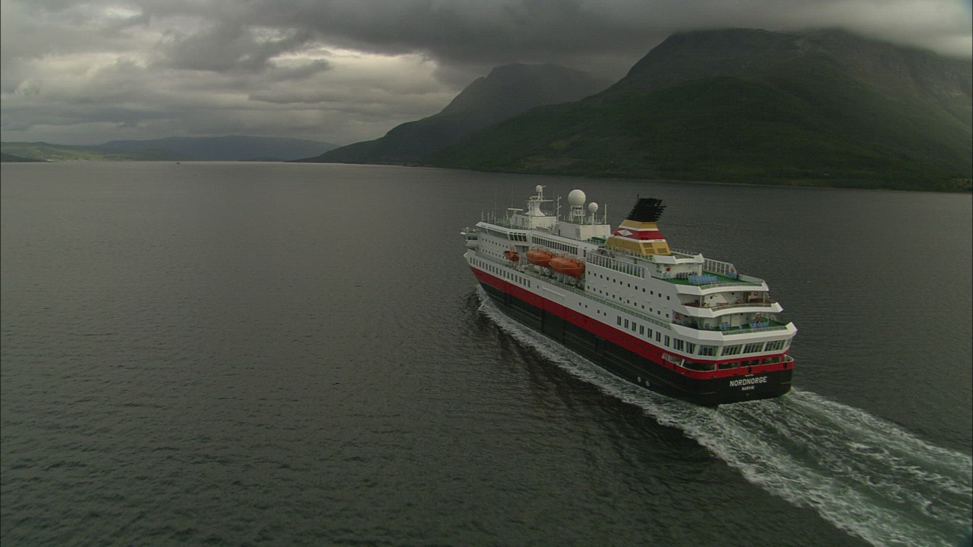 498430 - Ship wake far distant cruise ship following and snow capped mountains in Alaska inside passage