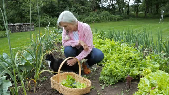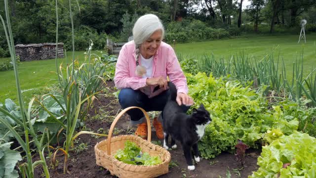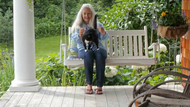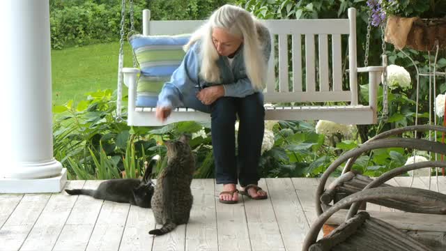 A lazy tabby cat a family dog rest outside on a warm summer evening.