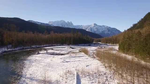698917 - Drone Flying from River Up to Mountains with Winter Snow and Blue Sky
