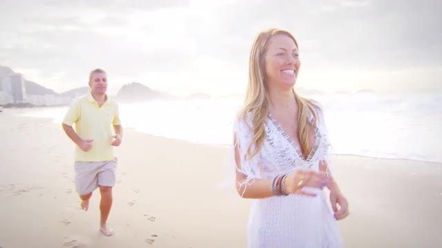 > Brazilian couple running down a beach in Brazil