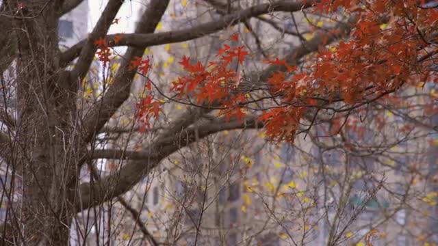 Distant autumnal leaves in sparse wood to foreground snail on tree. Single Shot. Format: ProRes 422 HQ