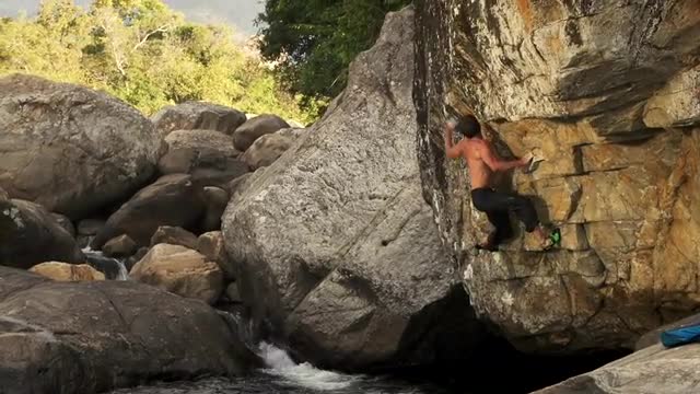 Rock climber climbing over natural pool and falling 2