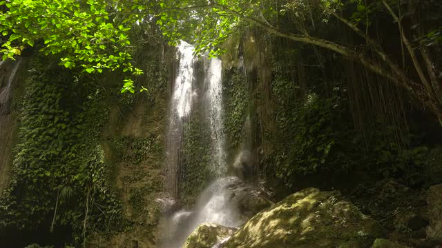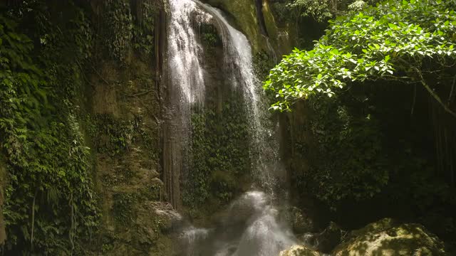 Rock climber swims in natural pool after rock climbing fal in water. Malawi, Africa. Footage of the above pool climbing action also in portfolio