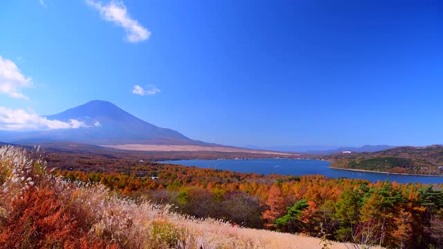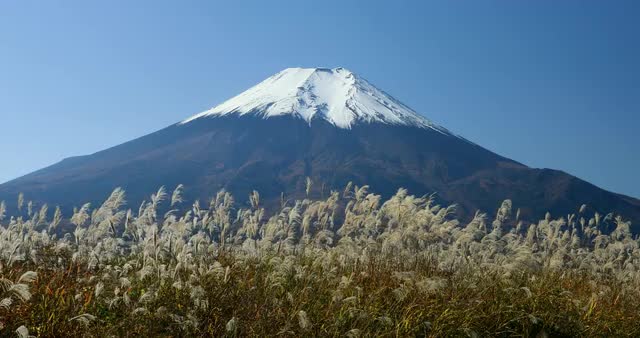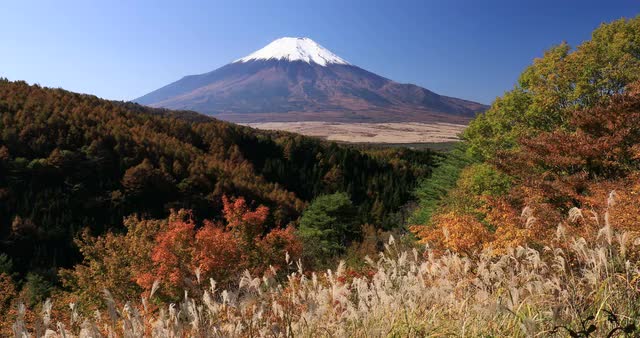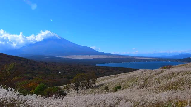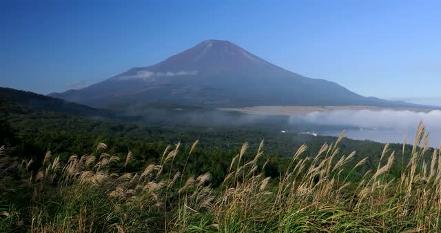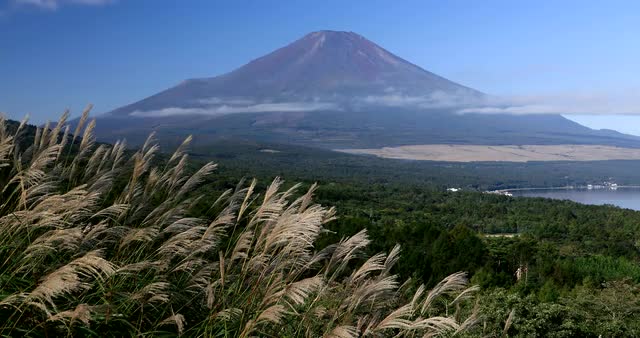 687918 - Peaceful view of Mount Fuji with Lake Yamanaka and silver grass in the morning, Yamanashi Prefecture
