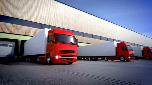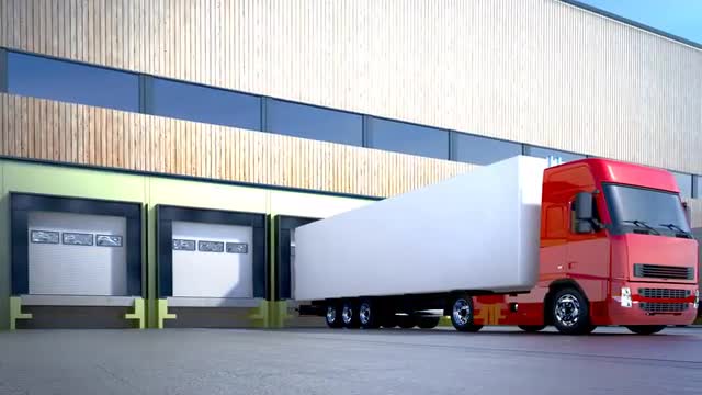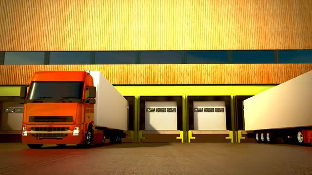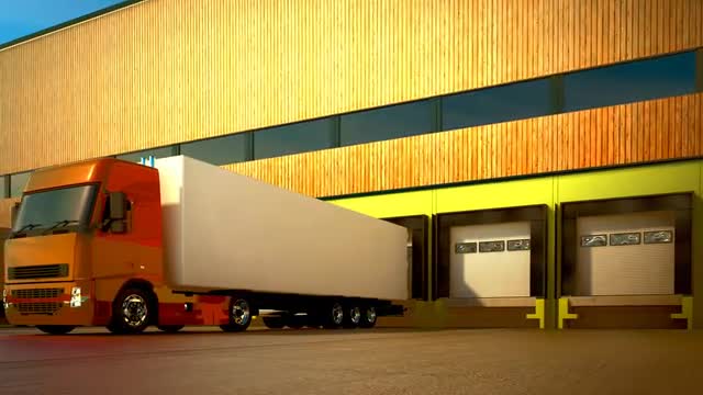3d animation of unloading cargo from truck to warehouse.
