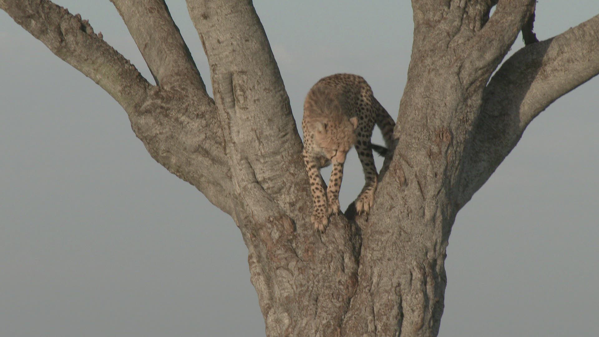 A cheetah looks for game from a tree in the Masai Mara, Kenya, Africa.