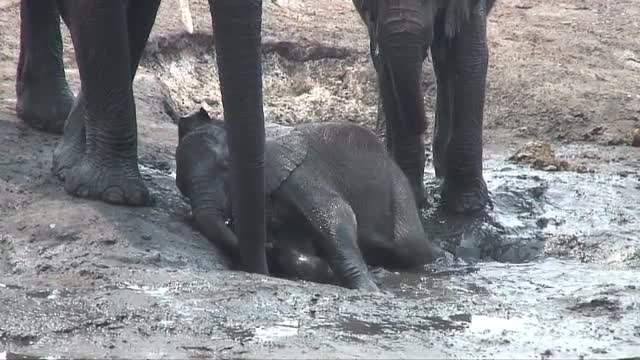 271055 - Elephant Calf Struggles In Mud