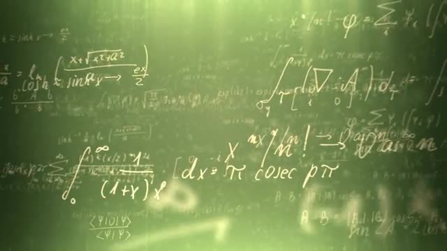Animation presents handwritten mathematical formulas on green background flying through the camera.