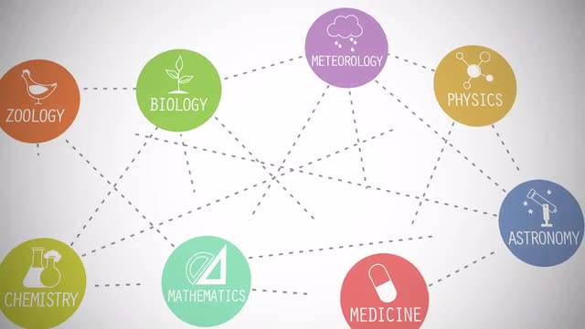 Words along with vector images present various branches of science and relations between them in dynamic animation. Colorful circles on a white background.