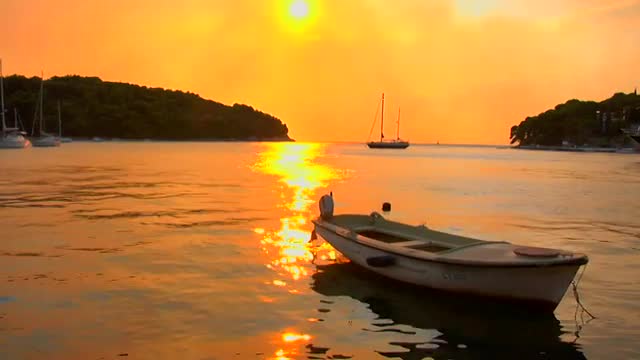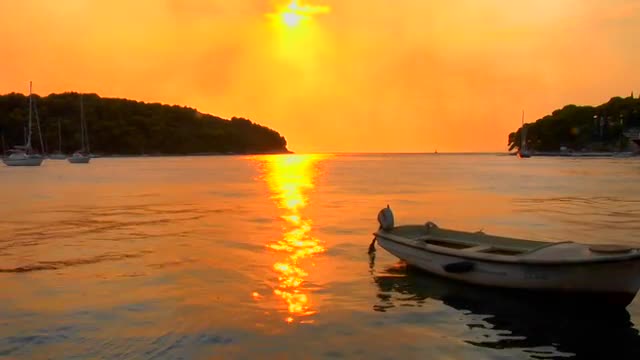182901 - A small boat gently floats as a Croatian sunset transpires.