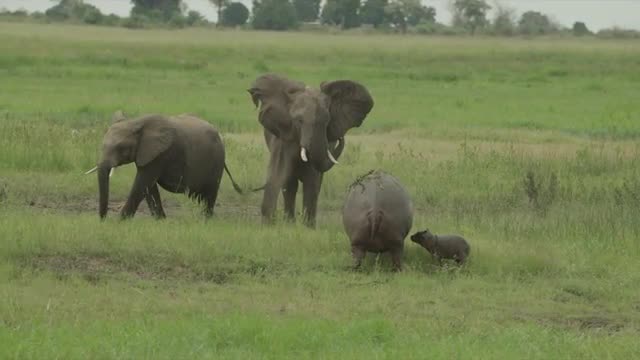 288594 - Two elephants confront hippo and baby